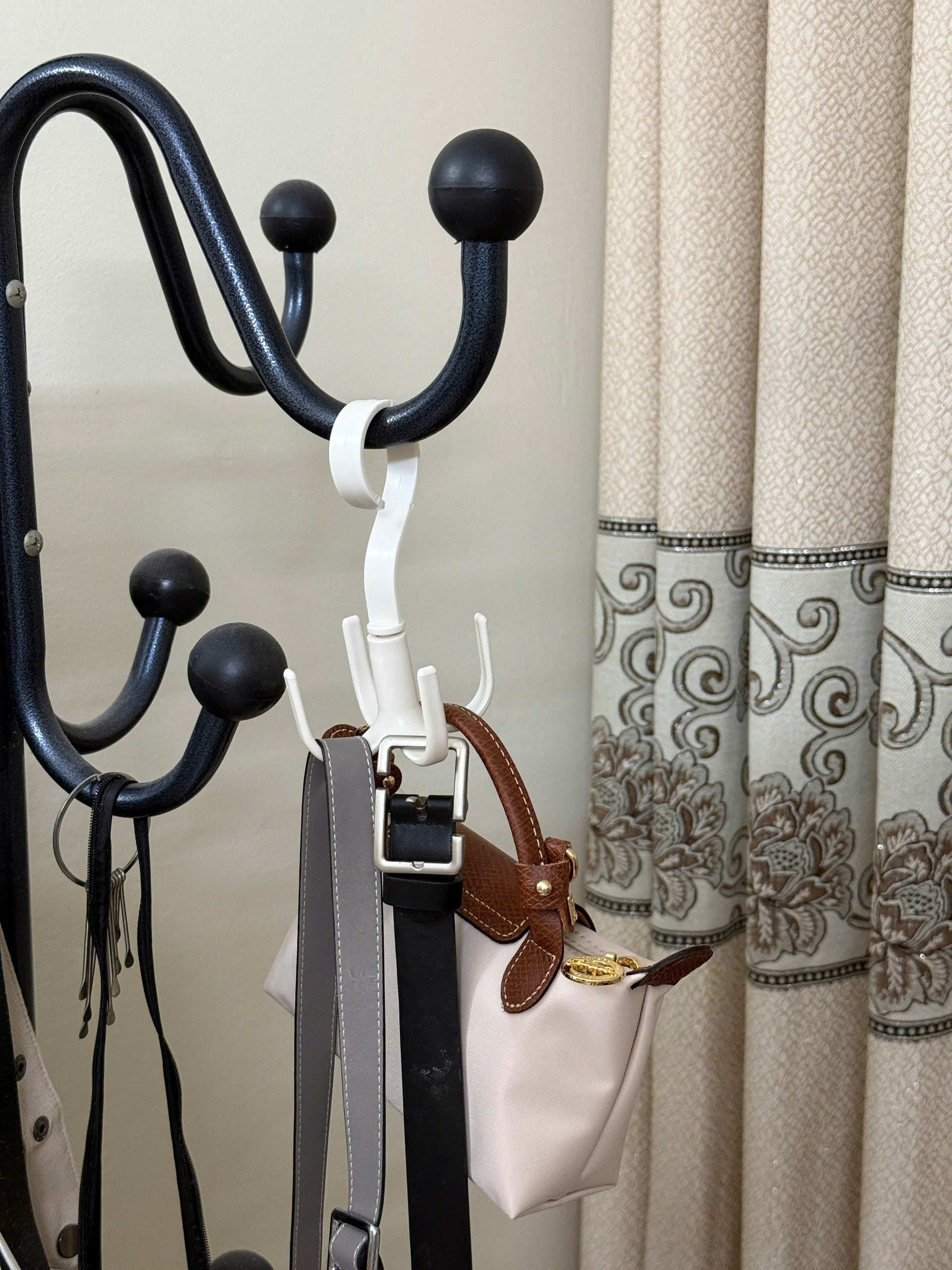 – Công dụng: Móc treo xoay 360 độ có 4 móc. Móc phía trên hình dạng lưỡi câu giúp cố định vào thanh treo/các cột có đường kính lên đến khoảng 3,5 cm. Sản phẩm cho phép bạn treo và cất giữ mũ, thắt lưng, túi xách và các vật dụng nhỏ khác nhau trong cùng không gian như tủ quần áo hoặc dùng để phơi giày, phơi mũ, phơi đồ….