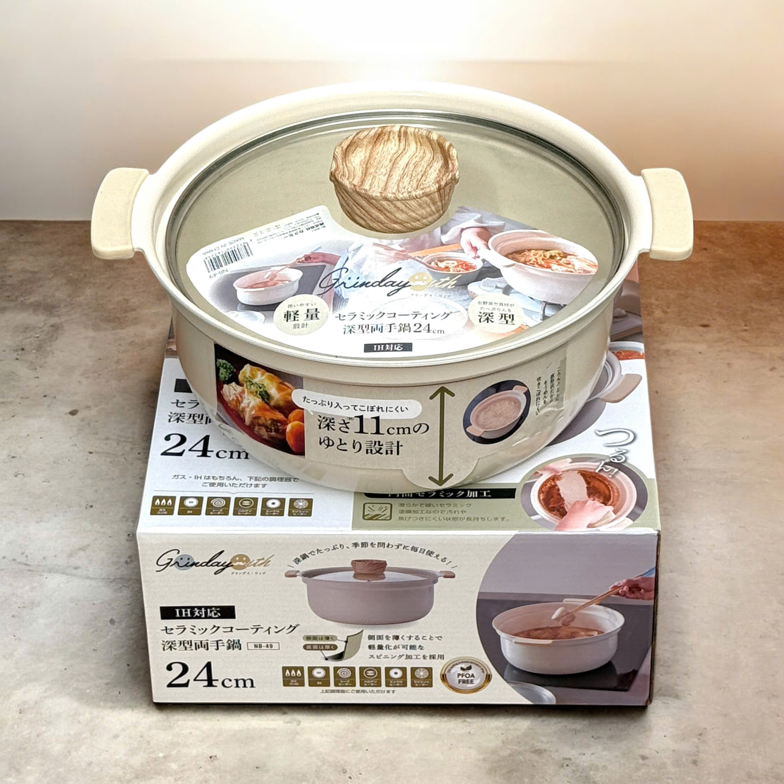 – Công dụng: Nồi được làm bằng hợp kim nhôm đúc nguyên khối chắc chắn, bề mặt chảo phủ lớp chống dính ceramic không chứa PFOA an toàn và thân thiện. Nắp kính đi kèm giúp dễ dàng theo dõi quá trình nấu và ngăn hơi nước thoát ra ngoài, đảm bảo nấu ăn hiệu quả. Dung tích 5.0L cỡ đại dáng sâu này hoàn hảo để nấu các món ăn như món hầm, món súp, phù hợp cho gia đình 4-6 người. Có thể dùng cho mọi loại bếp (Bếp gas, bếp điện từ, bếp hồng ngoại, bếp điện…). Thiết kế tông màu nhẹ nhàng hài hòa với nhà bếp của bạn