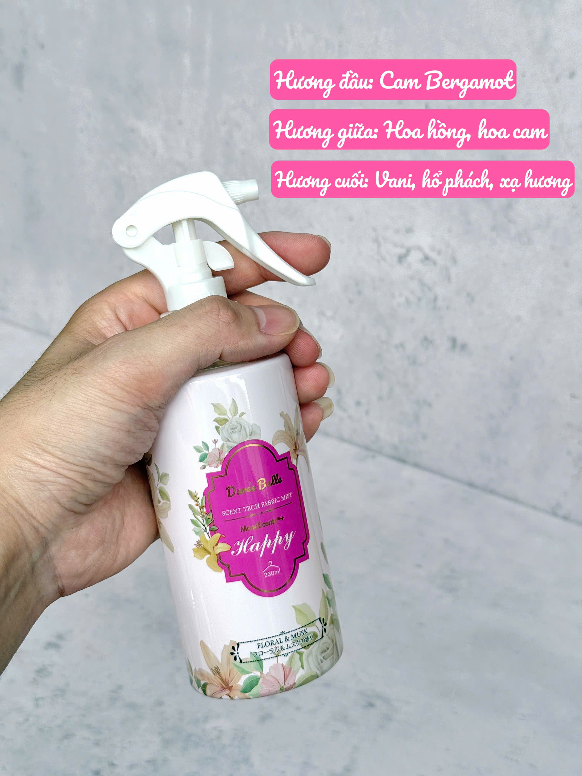 Nước hoa quần áo Duree Balle 230ml, hương hoa cỏ và xạ hương (hồng)