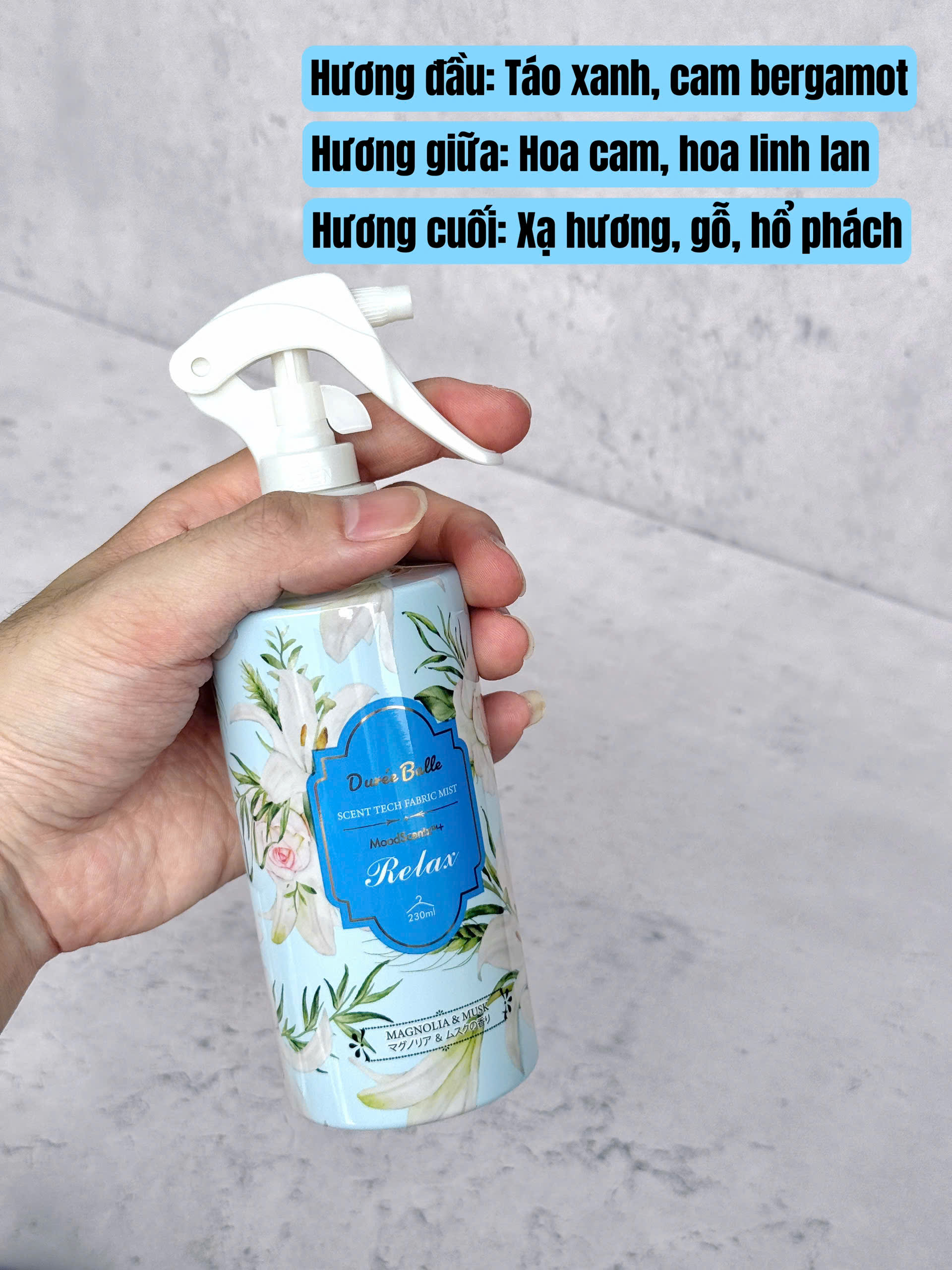 – Công dụng: xịt thơm quần áo, vải vóc, không gian sống. Chai xịt thơm sử dụng hương thơm MoodScentz™ độc quyền của Givaudan. Quần áo sau khi xịt thơm giống như cơ thể được xịt một mùi nước hoa sang trọng, nhẹ nhàng, tinh tế của hương hoa mộc lan và xạ hương trắng.