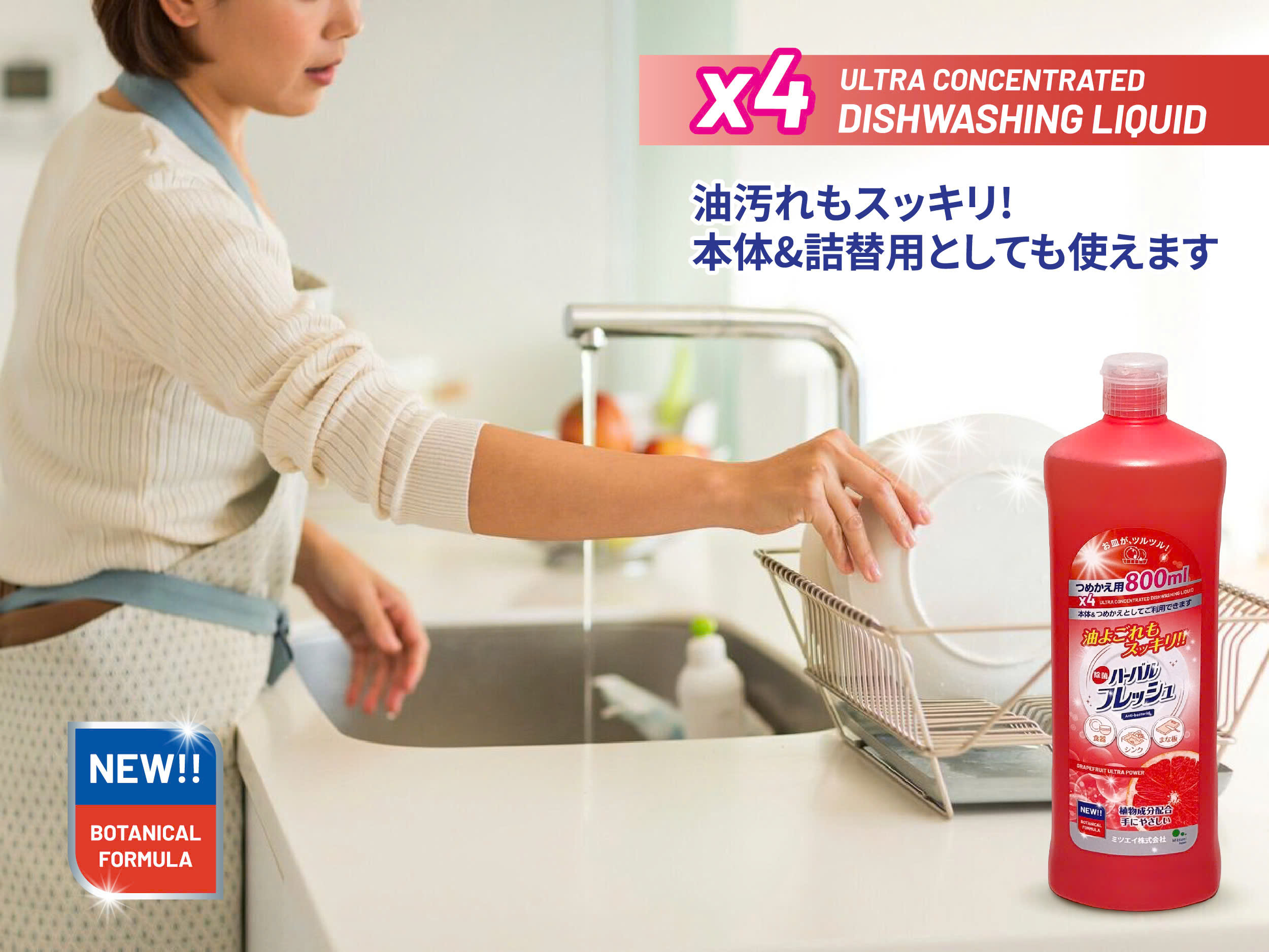 – Công dụng: Là sản phẩm nước rửa chén rất đậm đặc (gấp 4 lần các loại rửa chén thông thường) giúp rửa sạch và đánh bay hoàn toàn vết dầu mỡ trên chén bát, nồi chảo và đồ dùng nhà bếp khác. Hỗ trợ diệt vi khuẩn cao ngay cả trên miếng rửa chén, an toàn sử dụng. Thành phần thực vật dịu nhẹ và trung tính không làm hại, làm khô da tay. Hương bưởi hồng tươi mát dễ chịu theo công thức Herbal Fresh của thương hiệu Mitsuei Japan. Thiết kế nắp bật rất dễ sử dụng, thân chai nhỏ gọn tiết kiệm diện tích khu vực rửa chén bát.