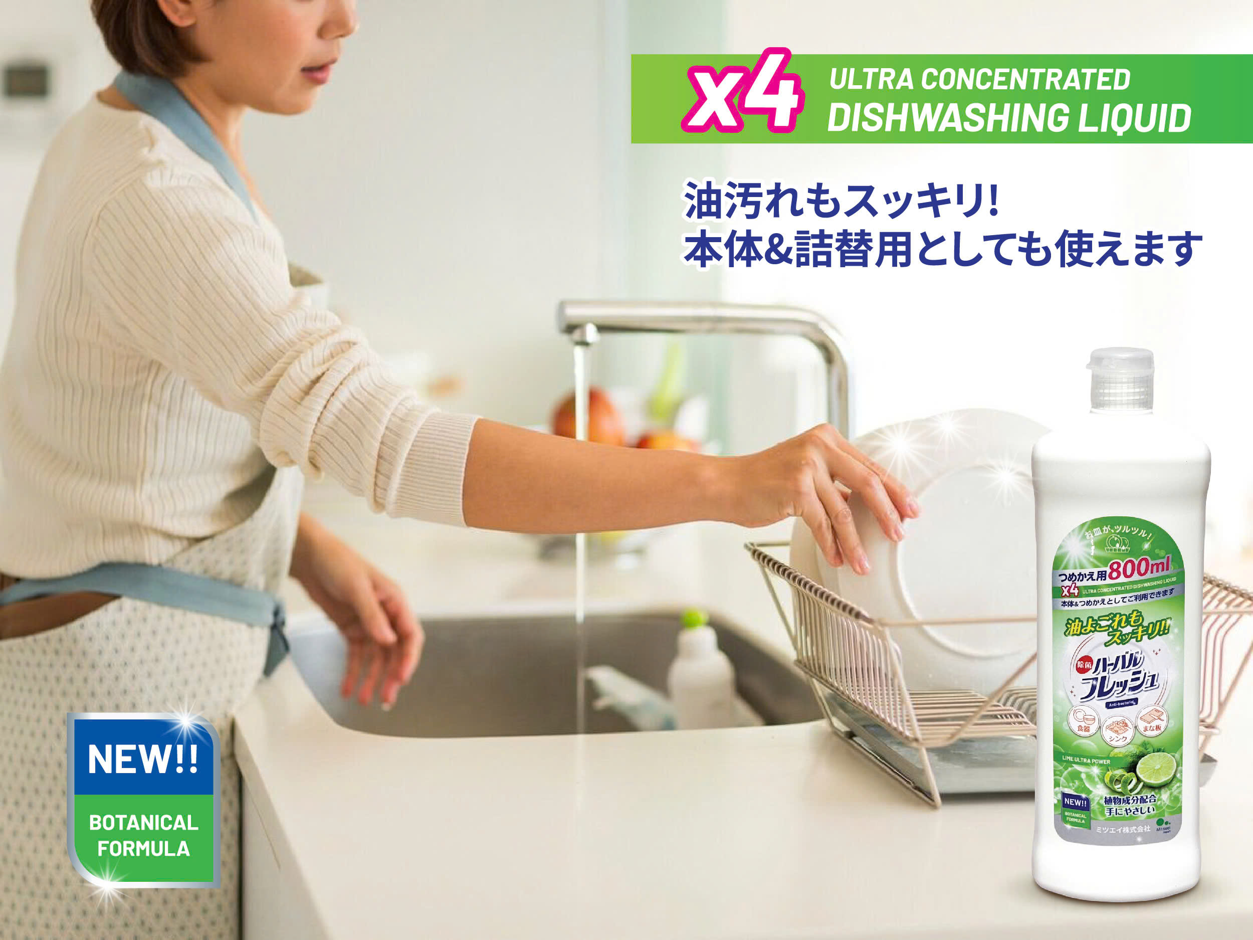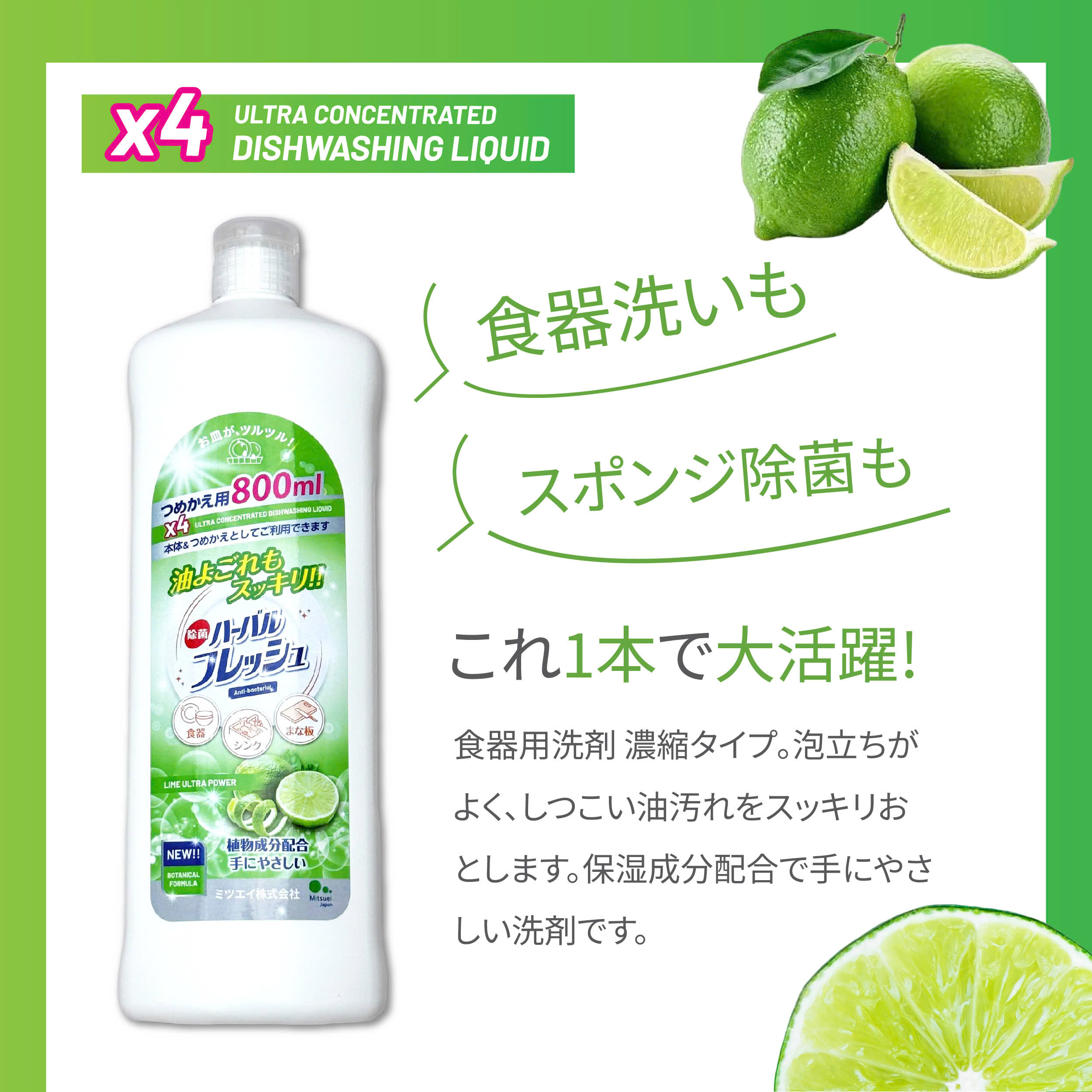 – Công dụng: Là sản phẩm nước rửa chén rất đậm đặc (gấp 4 lần các loại rửa chén thông thường) giúp rửa sạch và đánh bay hoàn toàn vết dầu mỡ trên chén bát, nồi chảo và đồ dùng nhà bếp khác. Hỗ trợ diệt vi khuẩn cao ngay cả trên miếng rửa chén, an toàn sử dụng. Thành phần thực vật dịu nhẹ và trung tính không làm hại, làm khô da tay. Hương chanh tươi mát dễ chịu theo công thức Herbal Fresh của thương hiệu Mitsuei Japan. Thiết kế nắp bật rất dễ sử dụng, thân chai nhỏ gọn tiết kiệm diện tích khu vực rửa chén bát.
